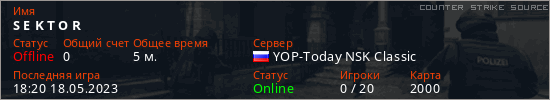 Играет на Counter Strike Source сервере. Страна: РоссияПервый раз замечен 18:18 18.05.2023