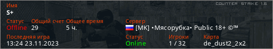 Играет на Counter Strike 1.6 сервере. Страна: РоссияПервый раз замечен 21:13 09.07.2023