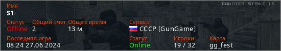 Играет на Counter Strike 1.6 сервере. Страна: РоссияПервый раз замечен 19:45 01.06.2024
