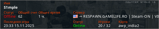 Играет на Counter Strike 1.6 сервере. Страна: СШАПервый раз замечен 12:28 21.02.2025