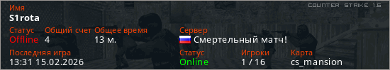 Играет на Counter Strike 1.6 сервере. Страна: РоссияПервый раз замечен 17:35 14.02.2026
