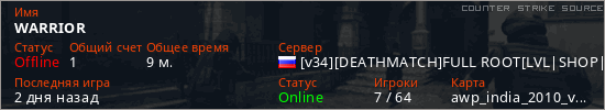 Играет на Counter Strike Source сервере. Страна: РоссияПервый раз замечен 17:53 28.12.2024