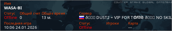 Играет на Counter Strike Global Offensive сервере. Страна: РоссияПервый раз замечен 12:12 09.01.2026