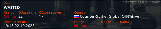 Играет на Counter Strike Source сервере. Страна: РоссияПервый раз замечен 20:58 12.09.2025