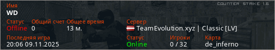 Играет на Counter Strike 1.6 сервере. Страна: ЛатвияПервый раз замечен 18:30 09.11.2025