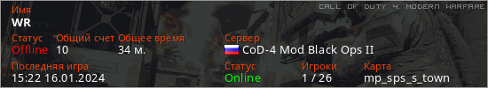 Играет на Call of Duty 4: Modern Warfare сервере. Страна: РоссияПервый раз замечен 16:21 12.01.2024