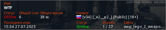 Последний раз был в сети 15:34 27.07.2025 Игрок с таким ником замечен на 36 серверах