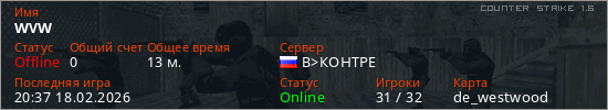 Играет на Counter Strike 1.6 сервере. Страна: РоссияПервый раз замечен 19:51 18.02.2026
