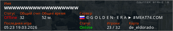 Играет на Counter Strike 1.6 сервере. Страна: РоссияПервый раз замечен 03:15 19.03.2026
