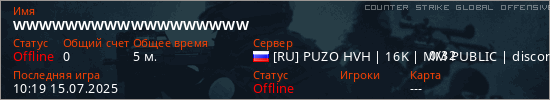 Играет на Counter Strike Global Offensive сервере. Страна: РоссияПервый раз замечен 10:15 15.07.2025