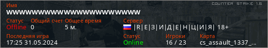 Играет на Counter Strike 1.6 сервере. Страна: РоссияПервый раз замечен 17:23 31.05.2024