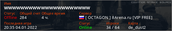 Играет на Counter Strike Source сервере. Страна: РоссияПервый раз замечен 17:51 31.12.2021
