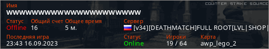 Играет на Counter Strike Source сервере. Страна: РоссияПервый раз замечен 23:41 16.09.2023