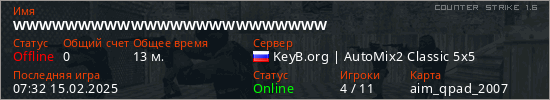 Играет на Counter Strike 1.6 сервере. Страна: РоссияПервый раз замечен 03:39 20.08.2024