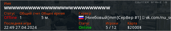 Играет на Counter Strike 1.6 сервере. Страна: РоссияПервый раз замечен 22:45 27.04.2024