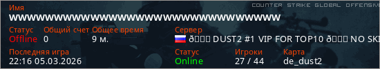 Играет на Counter Strike Global Offensive сервере. Страна: РоссияПервый раз замечен 21:37 05.03.2026