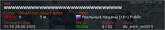 Играет на Counter Strike 1.6 сервере. Страна: РоссияПервый раз замечен 11:08 28.06.2025