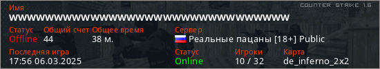 Последний раз был в сети 17:56 06.03.2025 Игрок с таким ником замечен на 33 серверах