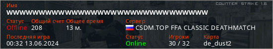 Последний раз был в сети 00:32 13.06.2024 Игрок с таким ником замечен на 33 серверах