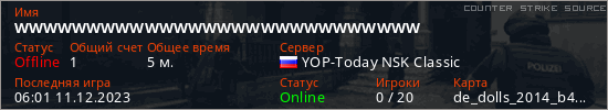 Играет на Counter Strike Source сервере. Страна: РоссияПервый раз замечен 05:59 11.12.2023