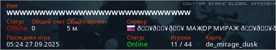 Играет на Counter Strike Global Offensive сервере. Страна: РоссияПервый раз замечен 05:05 27.09.2025