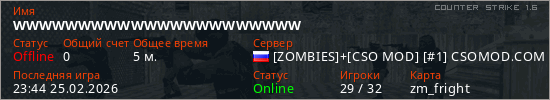 Играет на Counter Strike 1.6 сервере. Страна: РоссияПервый раз замечен 23:40 25.02.2026