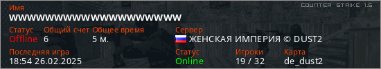 Играет на Counter Strike 1.6 сервере. Страна: РоссияПервый раз замечен 18:42 26.02.2025
