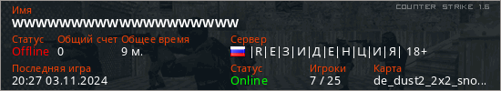 Играет на Counter Strike 1.6 сервере. Страна: РоссияПервый раз замечен 18:55 11.03.2024