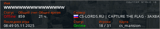 Играет на Counter Strike 1.6 сервере. Страна: РоссияПервый раз замечен 22:31 06.09.2020