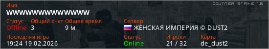 Играет на Counter Strike 1.6 сервере. Страна: РоссияПервый раз замечен 07:50 16.02.2026
