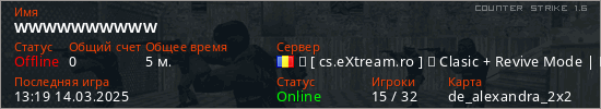Играет на Counter Strike 1.6 сервере. Страна: РумынияПервый раз замечен 13:17 14.03.2025