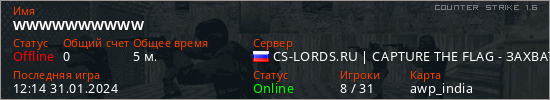 Играет на Counter Strike 1.6 сервере. Страна: РоссияПервый раз замечен 12:10 31.01.2024