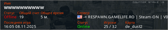 Играет на Counter Strike 1.6 сервере. Страна: СШАПервый раз замечен 15:59 08.11.2025
