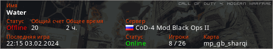 Играет на Call of Duty 4: Modern Warfare сервере. Страна: РоссияПервый раз замечен 18:47 19.01.2024