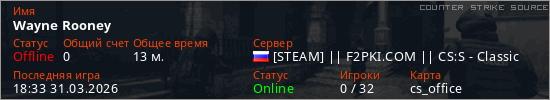 Играет на Counter Strike Source сервере. Страна: РоссияПервый раз замечен 14:10 24.03.2026