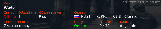 Играет на Counter Strike Source сервере. Страна: РоссияПервый раз замечен 19:26 12.02.2026