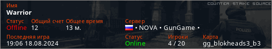 Играет на Counter Strike Source сервере. Страна: РоссияПервый раз замечен 19:54 11.08.2024