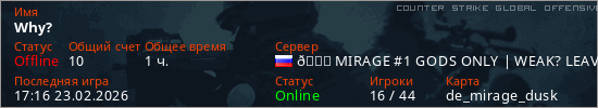 Играет на Counter Strike Global Offensive сервере. Страна: РоссияПервый раз замечен 19:29 14.03.2024