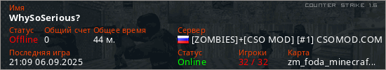 Играет на Counter Strike 1.6 сервере. Страна: РоссияПервый раз замечен 23:39 30.08.2025