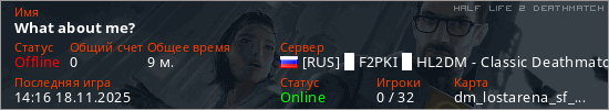 Играет на Half Life 2 DeathMatch сервере. Страна: РоссияПервый раз замечен 11:37 16.11.2025
