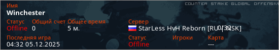 Играет на Counter Strike Global Offensive сервере. Страна: РоссияПервый раз замечен 03:59 05.12.2025