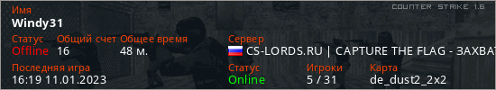 Играет на Counter Strike 1.6 сервере. Страна: РоссияПервый раз замечен 20:00 10.01.2023