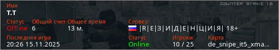 Играет на Counter Strike 1.6 сервере. Страна: РоссияПервый раз замечен 11:33 09.11.2025