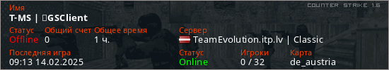 Играет на Counter Strike 1.6 сервере. Страна: ЛатвияПервый раз замечен 19:37 05.02.2025