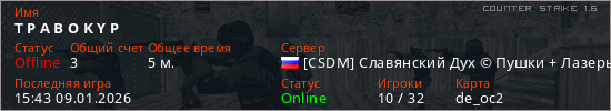 Играет на Counter Strike 1.6 сервере. Страна: РоссияПервый раз замечен 15:41 09.01.2026