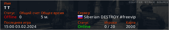 Играет на Counter Strike Source сервере. Страна: РоссияПервый раз замечен 14:54 03.02.2024