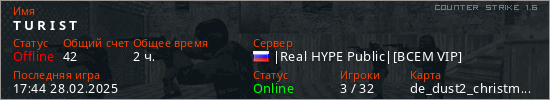 Играет на Counter Strike 1.6 сервере. Страна: РоссияПервый раз замечен 22:31 26.12.2024