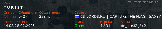 Играет на Counter Strike 1.6 сервере. Страна: РоссияПервый раз замечен 14:53 03.07.2021