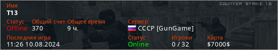 Играет на Counter Strike 1.6 сервере. Страна: РоссияПервый раз замечен 13:56 05.02.2024