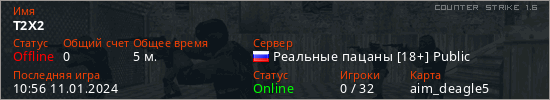 Играет на Counter Strike 1.6 сервере. Страна: РоссияПервый раз замечен 10:54 11.01.2024